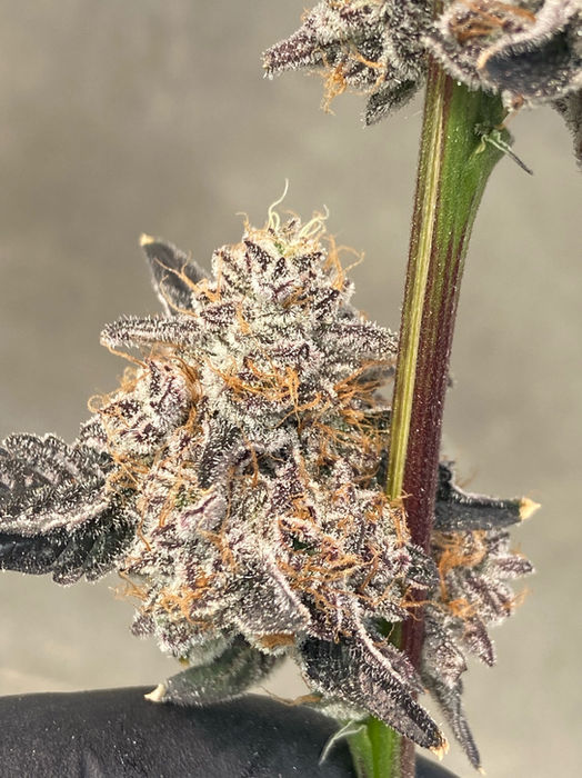 Garlic Snake Breath was our strongest strain for a few years coming in at 34%. She remains one of our favorites. She was also our first successful cross made with the local Maine strain “Snakes Cake”. She was contracted out as an exclusive cut to Kind Farms Reserves of Berwick Maine for her first year on the market. She runs 63-65 days in flower and had a medium to large yield. By the end of her grow, the buds will be glimmering with resin alongside the fan leaves which turn dark purple almost black. There are not many strains with bag appeal like her. She’s not a super-fast vegging plant, so she’s best under sea of green and to be packed in. When grown correctly, she can yield 2-3lbs per light. The terpenes are a rubber garlic with a slight hint of a grape here and there. She is one of our favorites for making great hash.